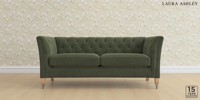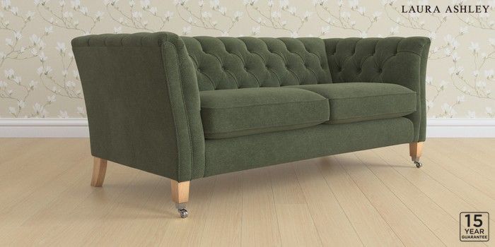 6.12.13 Buy Chatsworth Button Back by Laura Ashley 3 Seater Small Sofa Lundar Chenille Ivy Green Straight Chrome Castor - Light Oak from the Next UK online shop Click here to use our accessible website