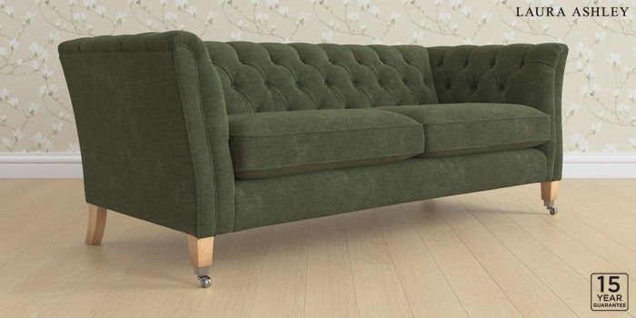 6.12.13 Buy Chatsworth Button Back by Laura Ashley 3 Seater Sofa Alwyn Velvet Ivy Green Straight Chrome Castor - Light Oak from the Next UK online shop Click here to use our accessible website