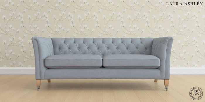 6.12.1 Buy Chatsworth Button Back by Laura Ashley 3 Seater Sofa Kinsham Seaspray Blue Straight Chrome Castor - Light Oak from the Next UK online shop Click here to use our accessible website