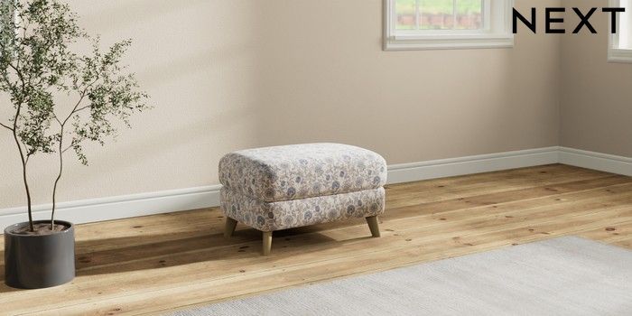 7.3.1 Buy Conway Relaxed Sit Footstool Relaxed Linen Look Print Woodblock Floral Blue Low Retro Tapered - Light from the Next UK online shop Click here to use our accessible website