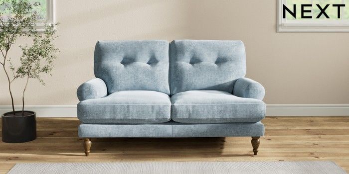 7.2.6 Buy Erin Buttoned Back Deep Relaxed Sit 2 Seater Small Sofa Plush Chenille Light Blue High Classic Turned - Mid from the Next UK online shop Click here to use our accessible website