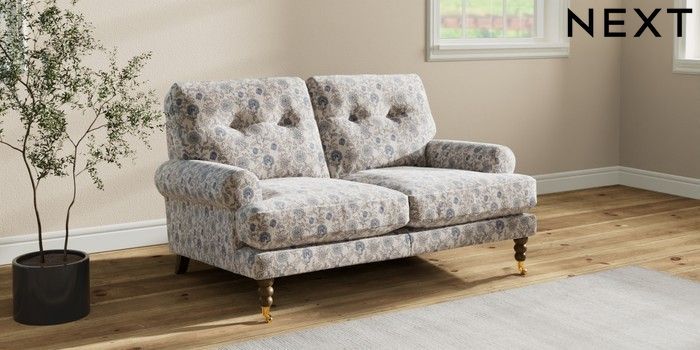 7.3.1 Buy Erin Buttoned Back Deep Relaxed Sit 2 Seater Small Sofa Relaxed Linen Look Print Woodblock Floral Blue High Classic Turned Brass Castor - Mid from the Next UK online shop Click here to use our accessible website