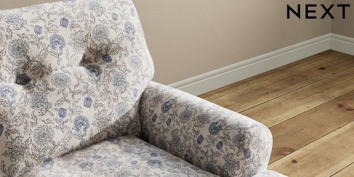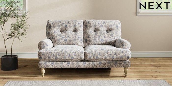7.3.1 Buy Erin Buttoned Back Deep Relaxed Sit 2 Seater Small Sofa Relaxed Linen Look Print Woodblock Floral Blue High Classic Turned - Light from the Next UK online shop Click here to use our accessible website