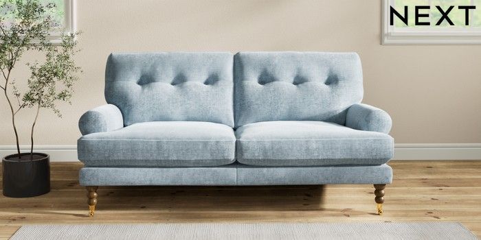 7.2.6 Buy Erin Buttoned Back Deep Relaxed Sit 3 Seater Small Sofa Plush Chenille Light Blue High Classic Turned Brass Castor - Mid from the Next UK online shop Click here to use our accessible website