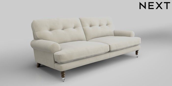 7.0.3 Buy Erin Buttoned Back Deep Relaxed Sit 3 Seater Sofa Luxe Chenille Oyster High Classic Turned Chrome Castor - Mid from the Next UK online shop Click here to use our accessible website