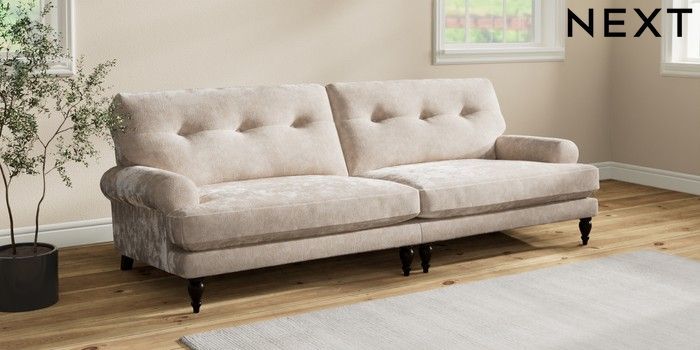 7.3.1 Buy Erin Buttoned Back Deep Relaxed Sit 4 Seater Large Sofa Distressed Velour Mid Natural High Classic Turned - Dark from the Next UK online shop Click here to use our accessible website