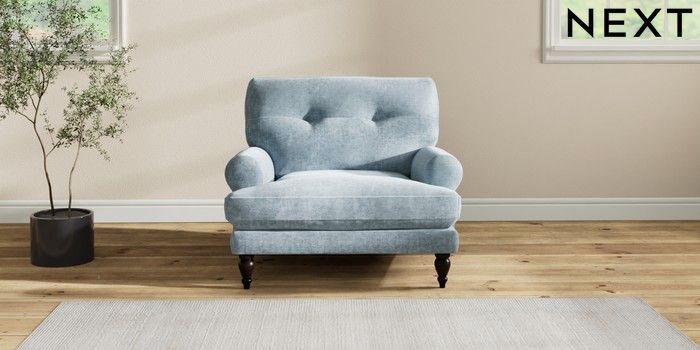7.2.6 Buy Erin Buttoned Back Deep Relaxed Sit Armchair Plush Chenille Light Blue High Classic Turned - Dark from the Next UK online shop Click here to use our accessible website