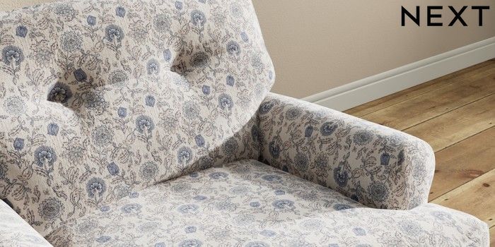 7.3.1 Buy Erin Buttoned Back Deep Relaxed Sit Armchair Relaxed Linen Look Print Woodblock Floral Blue High Classic Turned Brass Castor - Light from the Next UK online shop Click here to use our accessible website