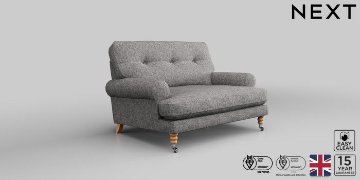 6.12.1 Buy Erin Buttoned Back Deep Relaxed Sit 3 Seater Small Sofa Chunky Boucle Easy Clean Light Grey High Classic Turned Chrome Castor - Light from the Next UK online shop Click here to use our accessible website