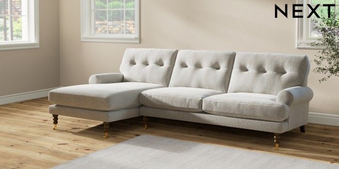 7.2.6 Buy Erin Buttoned Back Deep Relaxed Sit Medium Sofa Chaise - Left Hand Multi Weave Light Blue High Classic Turned Brass Castor - Mid from the Next UK online shop Click here to use our accessible website