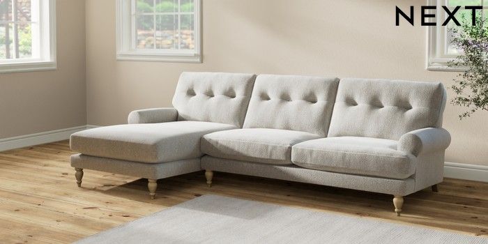 7.2.6 Buy Erin Buttoned Back Deep Relaxed Sit Medium Sofa Chaise - Left Hand Multi Weave Light Blue High Classic Turned - Light from the Next UK online shop Click here to use our accessible website