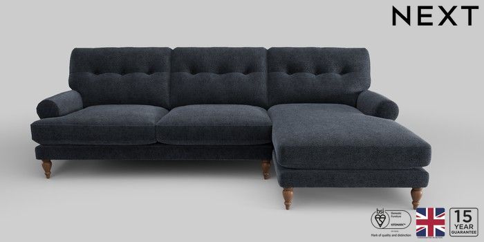 6.12.1 Buy Erin Buttoned Back Deep Relaxed Sit Medium Sofa Chaise - Right Hand Boucle Chenille Dark Slate Blue High Classic Turned - Mid from the Next UK online shop Click here to use our accessible website