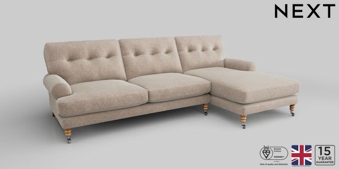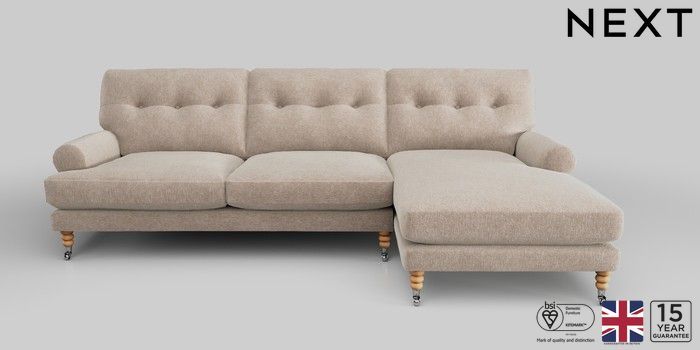 6.12.1 Buy Erin Buttoned Back Deep Relaxed Sit Medium Sofa Chaise - Right Hand Cotswold Chenille Light Natural High Classic Turned Chrome Castor - Light from the Next UK online shop Click here to use our accessible website