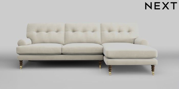 7.0.3 Buy Erin Buttoned Back Deep Relaxed Sit Medium Sofa Chaise - Right Hand Luxe Chenille Oyster High Classic Turned Brass Castor - Mid from the Next UK online shop Click here to use our accessible website