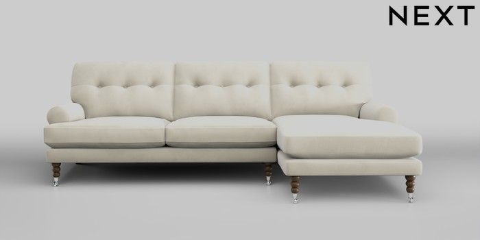 7.0.3 Buy Erin Buttoned Back Deep Relaxed Sit Medium Sofa Chaise - Right Hand Luxe Chenille Oyster High Classic Turned Chrome Castor - Mid from the Next UK online shop Click here to use our accessible website
