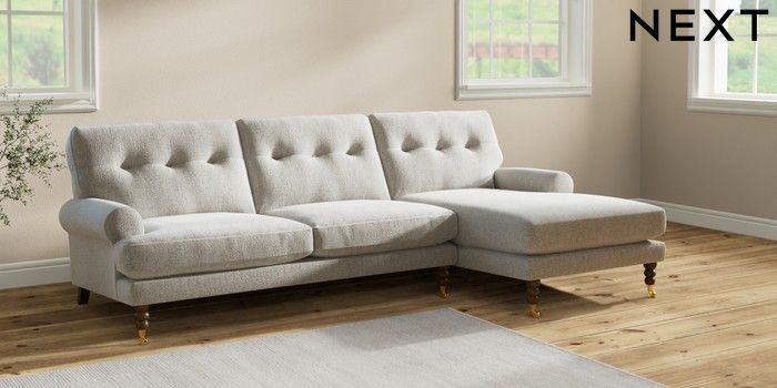 7.2.6 Buy Erin Buttoned Back Deep Relaxed Sit Medium Sofa Chaise - Right Hand Multi Weave Light Blue High Classic Turned Brass Castor - Mid from the Next UK online shop Click here to use our accessible website
