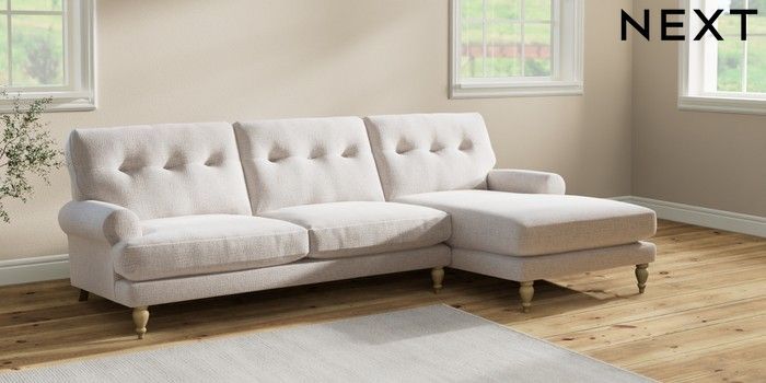 7.2.6 Buy Erin Buttoned Back Deep Relaxed Sit Medium Sofa Chaise - Right Hand Multi Weave Oyster High Classic Turned - Light from the Next UK online shop Click here to use our accessible website