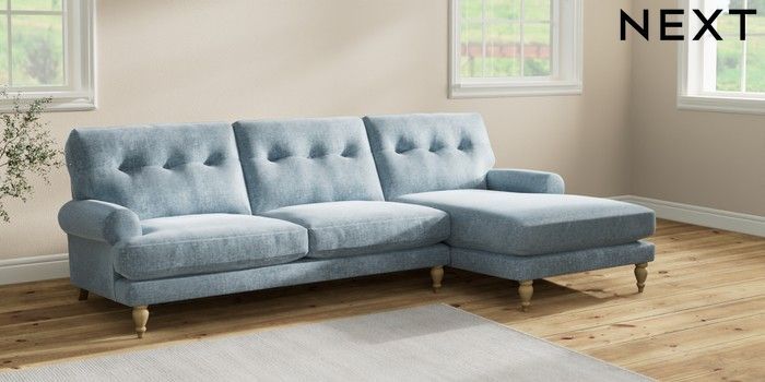 7.2.6 Buy Erin Buttoned Back Deep Relaxed Sit Medium Sofa Chaise - Right Hand Plush Chenille Light Blue High Classic Turned - Light from the Next UK online shop Click here to use our accessible website