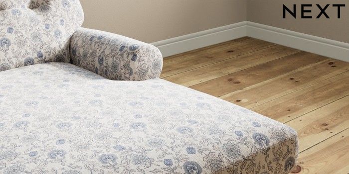 7.3.1 Buy Erin Buttoned Back Deep Relaxed Sit Medium Sofa Chaise - Right Hand Relaxed Linen Look Print Woodblock Floral Blue High Classic Turned - Dark from the Next UK online shop Click here to use our accessible website
