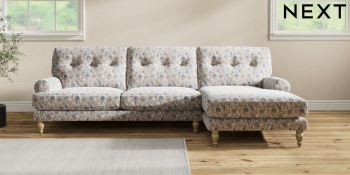 7.3.1 Buy Erin Buttoned Back Deep Relaxed Sit Medium Sofa Chaise - Right Hand Relaxed Linen Look Print Woodblock Floral Blue High Classic Turned - Light from the Next UK online shop Click here to use our accessible website