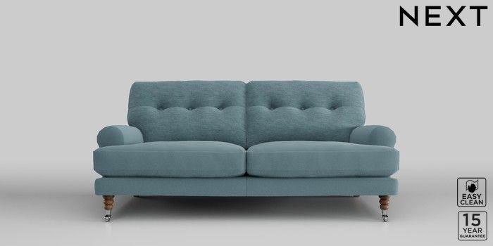 6.11.8 Buy Erin Buttoned Back Deep Sit 3 Seater Small Sofa Fine Chenille Easy Clean Mid Blue High Classic Turned Chrome Castor - Mid from the Next UK online shop Click here to use our accessible website