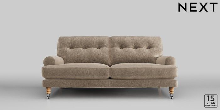 6.11.4 Buy Erin Buttoned Back Deep Sit 3 Seater Small Sofa Plush Chenille Mid Natural High Classic Turned Chrome Castor - Light from the Next UK online shop Click here to use our accessible website