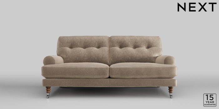 6.11.4 Buy Erin Buttoned Back Deep Sit 3 Seater Small Sofa Plush Chenille Mid Natural High Classic Turned Chrome Castor - Mid from the Next UK online shop Click here to use our accessible website