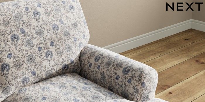 7.3.1 Buy Erin Deep Relaxed Sit 2 Seater Small Sofa Relaxed Linen Look Print Woodblock Floral Blue High Classic Turned Chrome Castor - Mid from the Next UK online shop Click here to use our accessible website