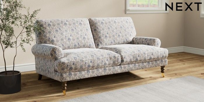 7.3.1 Buy Erin Deep Relaxed Sit 3 Seater Small Sofa Relaxed Linen Look Print Woodblock Floral Blue High Classic Turned Brass Castor - Mid from the Next UK online shop Click here to use our accessible website