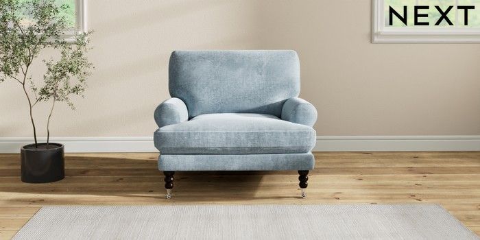 7.2.6 Buy Erin Deep Relaxed Sit Armchair Plush Chenille Light Blue High Classic Turned Chrome Castor - Dark from the Next UK online shop Click here to use our accessible website