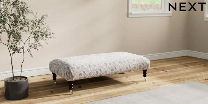7.3.1 Buy Erin Deep Relaxed Sit Extra Large Footstool Relaxed Linen Look Print Woodblock Floral Blue High Classic Turned Chrome Castor - Dark from the Next UK online shop Click here to use our accessible website