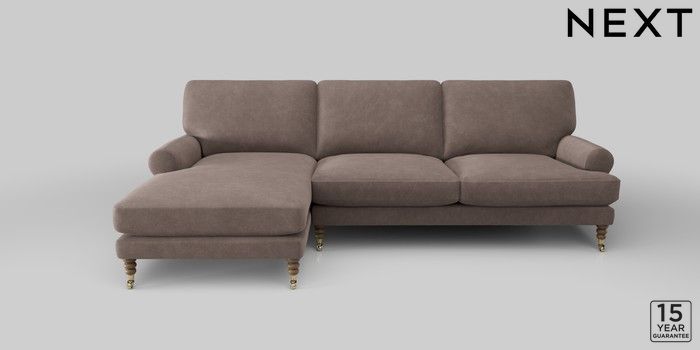 6.12.1 Buy Erin Deep Relaxed Sit Medium Sofa Chaise - Left Hand Luxe Chenille Mink Brown High Classic Turned Brass Castor - Dark from the Next UK online shop Click here to use our accessible website