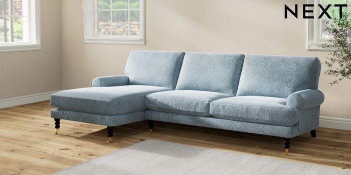 7.2.6 Buy Erin Deep Relaxed Sit Medium Sofa Chaise - Left Hand Plush Chenille Light Blue High Classic Turned Brass Castor - Dark from the Next UK online shop Click here to use our accessible website