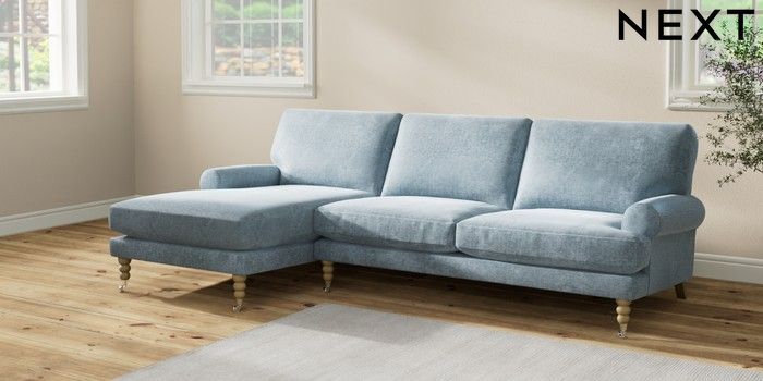 7.2.6 Buy Erin Deep Relaxed Sit Medium Sofa Chaise - Left Hand Plush Chenille Light Blue High Classic Turned Chrome Castor - Light from the Next UK online shop Click here to use our accessible website