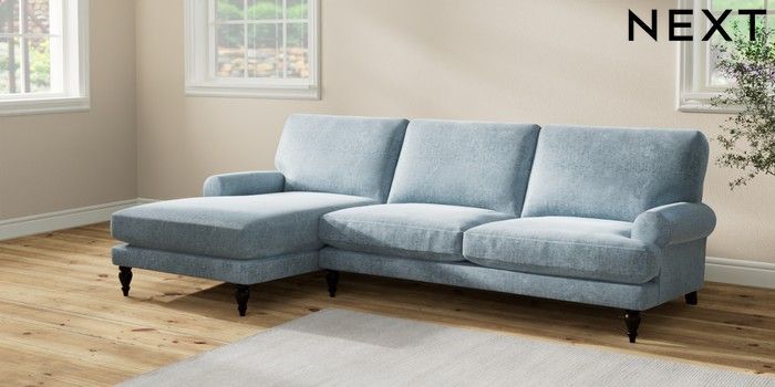 7.2.6 Buy Erin Deep Relaxed Sit Medium Sofa Chaise - Left Hand Plush Chenille Light Blue High Classic Turned - Dark from the Next UK online shop Click here to use our accessible website