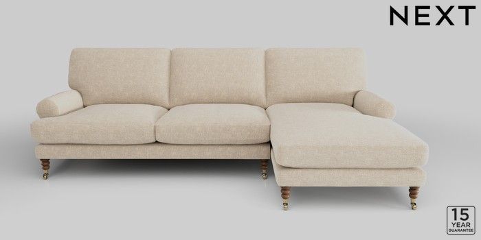 6.12.1 Buy Erin Deep Relaxed Sit Medium Sofa Chaise - Right Hand Chunky Weave Cream High Classic Turned Brass Castor - Mid from the Next UK online shop Click here to use our accessible website