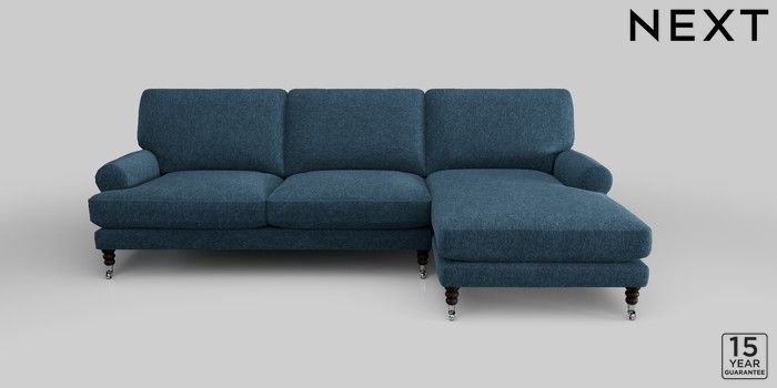 6.12.1 Buy Erin Deep Relaxed Sit Medium Sofa Chaise - Right Hand Cotswold Chenille Dark Blue High Classic Turned Chrome Castor - Dark from the Next UK online shop Click here to use our accessible website