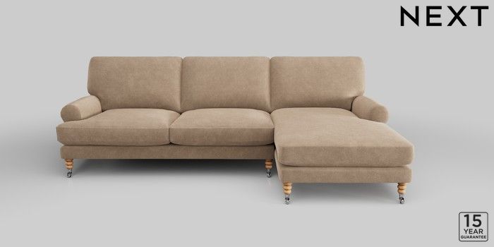6.12.1 Buy Erin Deep Relaxed Sit Medium Sofa Chaise - Right Hand Luxe Chenille Mid Camel Beige High Classic Turned Chrome Castor - Light from the Next UK online shop Click here to use our accessible website