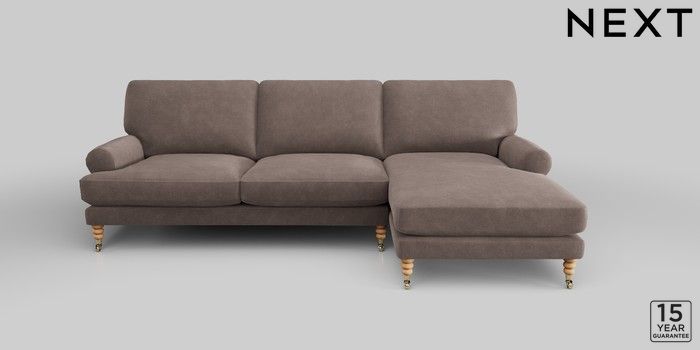 6.12.1 Buy Erin Deep Relaxed Sit Medium Sofa Chaise - Right Hand Luxe Chenille Mink Brown High Classic Turned Brass Castor - Light from the Next UK online shop Click here to use our accessible website