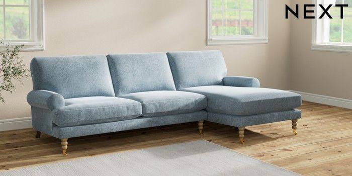 7.2.6 Buy Erin Deep Relaxed Sit Medium Sofa Chaise - Right Hand Plush Chenille Light Blue High Classic Turned Brass Castor - Light from the Next UK online shop Click here to use our accessible website