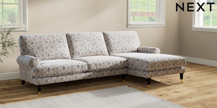 7.3.1 Buy Erin Deep Relaxed Sit Medium Sofa Chaise - Right Hand Relaxed Linen Look Print Woodblock Floral Blue High Classic Turned Brass Castor - Dark from the Next UK online shop Click here to use our accessible website