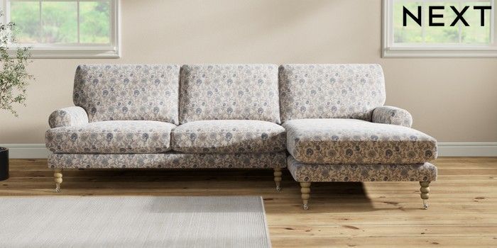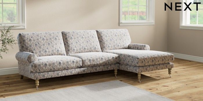 7.3.1 Buy Erin Deep Relaxed Sit Medium Sofa Chaise - Right Hand Relaxed Linen Look Print Woodblock Floral Blue High Classic Turned Chrome Castor - Light from the Next UK online shop Click here to use our accessible website