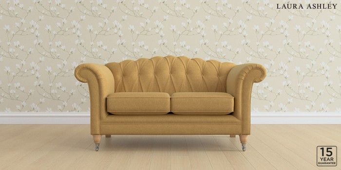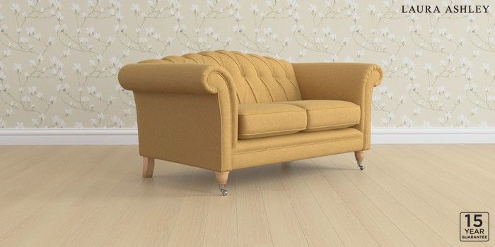 6.12.13 Buy Gloucester Button Back by Laura Ashley 2 Seater Small Sofa Peyton Ochre Yellow Low Chrome Castor - Light Oak from the Next UK online shop Click here to use our accessible website