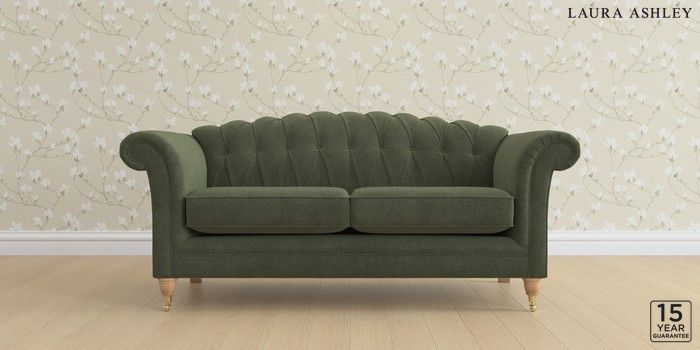 6.12.13 Buy Gloucester Button Back by Laura Ashley 3 Seater Small Sofa Lundar Chenille Ivy Green Low Brass Castor - Light Oak from the Next UK online shop Click here to use our accessible website