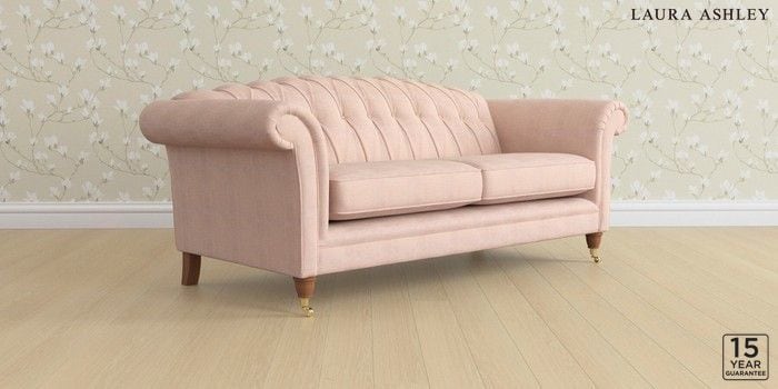 6.12.1 Buy Gloucester Button Back by Laura Ashley 3 Seater Sofa Edwin Chenille Blush Pink Low Brass Castor - Teak from the Next UK online shop Click here to use our accessible website