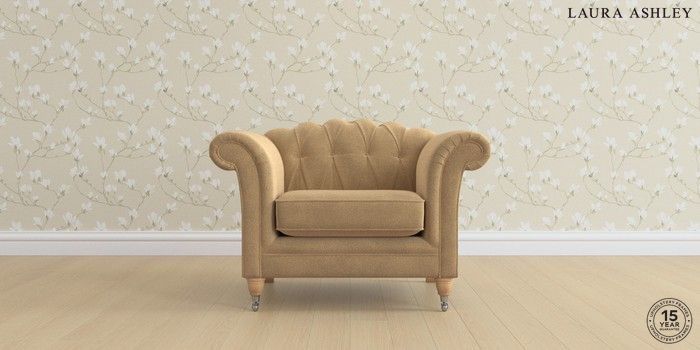 6.12.1 Buy Gloucester Button Back by Laura Ashley Armchair Lundar Chenille Caramel Natural Low Chrome Castor - Light Oak from the Next UK online shop Click here to use our accessible website