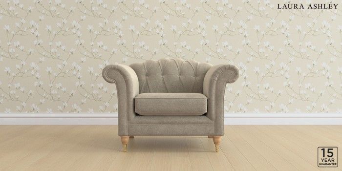 6.12.13 Buy Gloucester Button Back by Laura Ashley Armchair Lundar Chenille Truffle Natural Low Brass Castor - Light Oak from the Next UK online shop Click here to use our accessible website