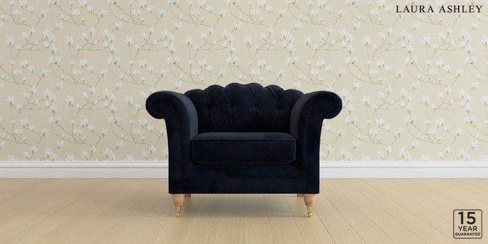 6.12.13 Buy Gloucester Button Back by Laura Ashley Armchair Orla Midnight Navy Low Brass Castor - Light Oak from the Next UK online shop Click here to use our accessible website