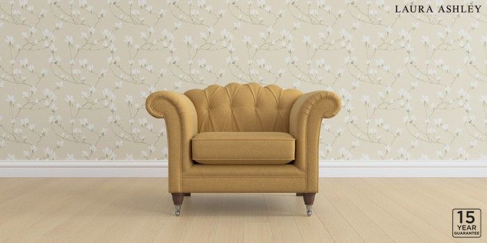 6.12.13 Buy Gloucester Button Back by Laura Ashley Armchair Peyton Ochre Yellow Low Chrome Castor - Chestnut from the Next UK online shop Click here to use our accessible website
