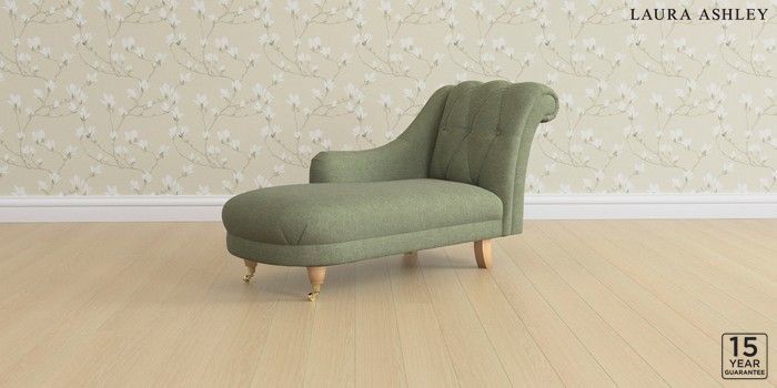6.12.1 Buy Gloucester Button Back by Laura Ashley Chaise Longue Left Hand Harley Moss Green Low Brass Castor - Light Oak from the Next UK online shop Click here to use our accessible website